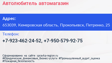 Автолюбитель, автомагазин по адресу 653039, Кемеровская область, Прокопьевск, Петренко, 25 в дальнейшем Организация, размещена в следующих категориях: