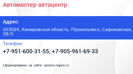 Автомастер, автоцентр по адресу 653024, Кемеровская область, Прокопьевск, Сафоновская, 28/3 в дальнейшем Организация, размещена в следующих категориях: