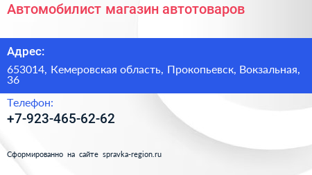 Автомобилист, магазин автотоваров по адресу 653014, Кемеровская область, Прокопьевск, Вокзальная, 36 в дальнейшем Организация, размещена в следующих категориях:
