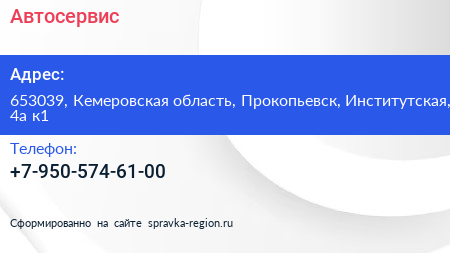 Автосервис по адресу 653039, Кемеровская область, Прокопьевск, Институтская, 4а к1 в дальнейшем Организация, размещена в следующих категориях: