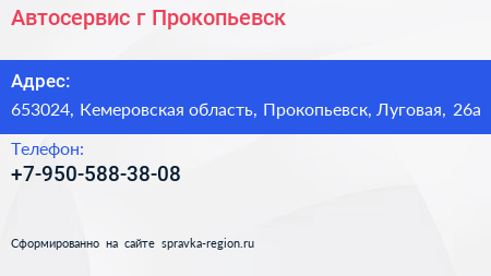 Автосервис, г. Прокопьевск по адресу 653024, Кемеровская область, Прокопьевск, Луговая, 26а в дальнейшем Организация, размещена в следующих категориях: