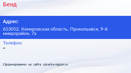 Бенд по адресу 653052, Кемеровская область, Прокопьевск, 9-й микрорайон, 7а в дальнейшем Организация, размещена в следующих категориях: