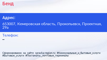 Бенд по адресу 653007, Кемеровская область, Прокопьевск, Проектная, 29а в дальнейшем Организация, размещена в следующих категориях: