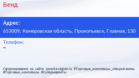 Бенд по адресу 653009, Кемеровская область, Прокопьевск, Главная, 130 в дальнейшем Организация, размещена в следующих категориях: