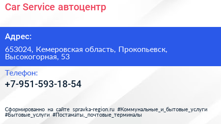 Car Service, автоцентр по адресу 653024, Кемеровская область, Прокопьевск, Высокогорная, 53 в дальнейшем Организация, размещена в следующих категориях: