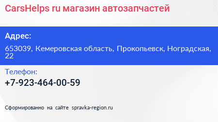 CarsHelps.ru, магазин автозапчастей по адресу 653039, Кемеровская область, Прокопьевск, Ноградская, 22 в дальнейшем Организация, размещена в следующих категориях: