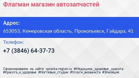 Флагман, магазин автозапчастей по адресу 653053, Кемеровская область, Прокопьевск, Гайдара, 41 в дальнейшем Организация, размещена в следующих категориях: