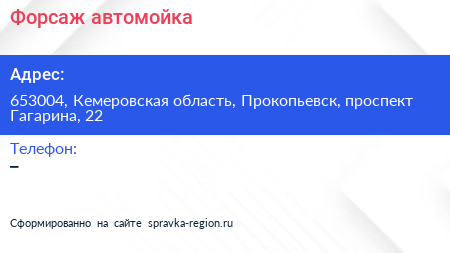 Форсаж, автомойка по адресу 653004, Кемеровская область, Прокопьевск, проспект Гагарина, 22 в дальнейшем Организация, размещена в следующих категориях: