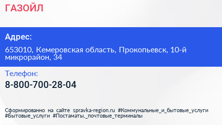 ГАЗОЙЛ по адресу 653010, Кемеровская область, Прокопьевск, 10-й микрорайон, 34 в дальнейшем Организация, размещена в следующих категориях: