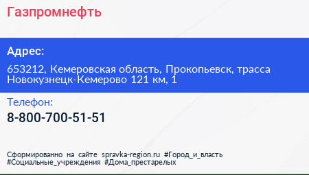 Газпромнефть по адресу 653212, Кемеровская область, Прокопьевск, трасса Новокузнецк-Кемерово 121 км, 1 в дальнейшем Организация, размещена в следующих категориях: