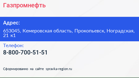 Газпромнефть по адресу 653045, Кемеровская область, Прокопьевск, Ноградская, 21 к1 в дальнейшем Организация, размещена в следующих категориях: