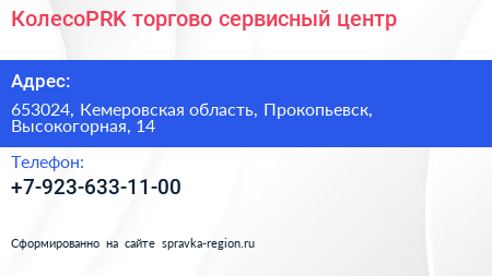 КолесоPRK, торгово-сервисный центр по адресу 653024, Кемеровская область, Прокопьевск, Высокогорная, 14 в дальнейшем Организация, размещена в следующих категориях: