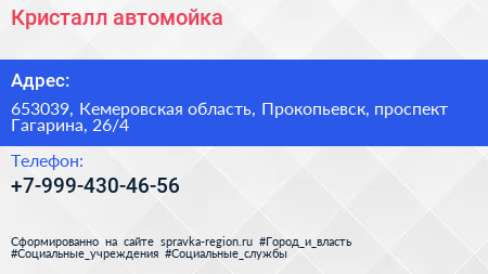 Кристалл, автомойка по адресу 653039, Кемеровская область, Прокопьевск, проспект Гагарина, 26/4 в дальнейшем Организация, размещена в следующих категориях: