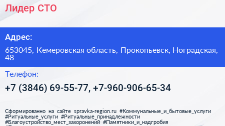 Лидер, СТО по адресу 653045, Кемеровская область, Прокопьевск, Ноградская, 48 в дальнейшем Организация, размещена в следующих категориях:
