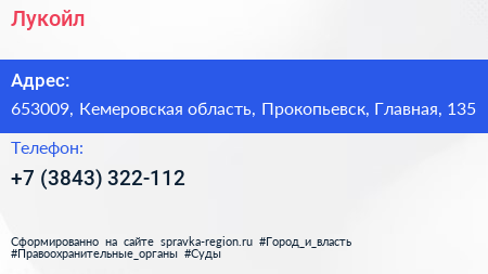 Лукойл по адресу 653009, Кемеровская область, Прокопьевск, Главная, 135 в дальнейшем Организация, размещена в следующих категориях: