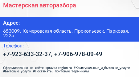 Мастерская авторазбора по адресу 653009, Кемеровская область, Прокопьевск, Парковая, 222а в дальнейшем Организация, размещена в следующих категориях: