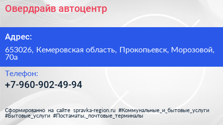 Овердрайв, автоцентр по адресу 653026, Кемеровская область, Прокопьевск, Морозовой, 70а в дальнейшем Организация, размещена в следующих категориях: