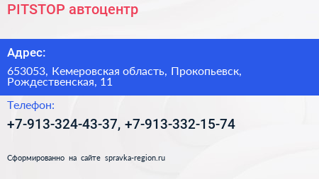 PITSTOP, автоцентр по адресу 653053, Кемеровская область, Прокопьевск, Рождественская, 11 в дальнейшем Организация, размещена в следующих категориях: