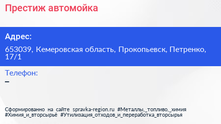 Престиж, автомойка по адресу 653039, Кемеровская область, Прокопьевск, Петренко, 17/1 в дальнейшем Организация, размещена в следующих категориях: