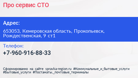 Про-сервис, СТО по адресу 653053, Кемеровская область, Прокопьевск, Рождественская, 9 ст1 в дальнейшем Организация, размещена в следующих категориях: