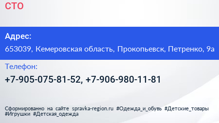 СТО по адресу 653039, Кемеровская область, Прокопьевск, Петренко, 9а в дальнейшем Организация, размещена в следующих категориях: