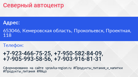 Северный, автоцентр по адресу 653046, Кемеровская область, Прокопьевск, Проектная, 118 в дальнейшем Организация, размещена в следующих категориях: