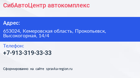 СибАвтоЦентр, автокомплекс по адресу 653024, Кемеровская область, Прокопьевск, Высокогорная, 14/4 в дальнейшем Организация, размещена в следующих категориях: