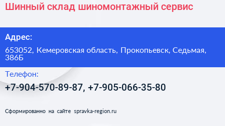 Шинный склад, шиномонтажный сервис по адресу 653052, Кемеровская область, Прокопьевск, Седьмая, 386Б в дальнейшем Организация, размещена в следующих категориях: