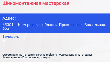 Шиномонтажная мастерская по адресу 653014, Кемеровская область, Прокопьевск, Вокзальная, 65а в дальнейшем Организация, размещена в следующих категориях: