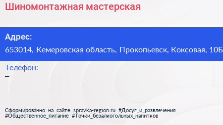 Шиномонтажная мастерская по адресу 653014, Кемеровская область, Прокопьевск, Коксовая, 10Б в дальнейшем Организация, размещена в следующих категориях: