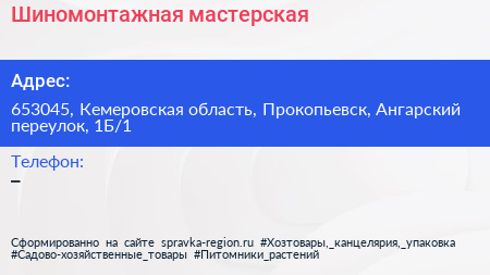 Шиномонтажная мастерская по адресу 653045, Кемеровская область, Прокопьевск, Ангарский переулок, 1Б/1 в дальнейшем Организация, размещена в следующих категориях: