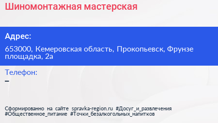 Шиномонтажная мастерская по адресу 653000, Кемеровская область, Прокопьевск, Фрунзе площадка, 2а в дальнейшем Организация, размещена в следующих категориях: