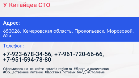 У Китайцев, СТО по адресу 653026, Кемеровская область, Прокопьевск, Морозовой, 62а в дальнейшем Организация, размещена в следующих категориях: