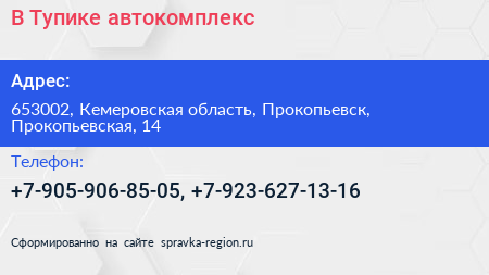 В Тупике, автокомплекс по адресу 653002, Кемеровская область, Прокопьевск, Прокопьевская, 14 в дальнейшем Организация, размещена в следующих категориях: