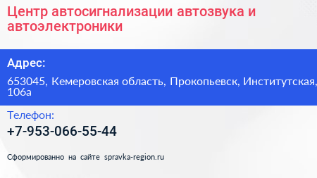 Центр автосигнализации, автозвука и автоэлектроники по адресу 653045, Кемеровская область, Прокопьевск, Институтская, 106а в дальнейшем Организация, размещена в следующих категориях:
