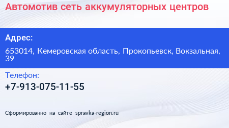 Автомотив, сеть аккумуляторных центров по адресу 653014, Кемеровская область, Прокопьевск, Вокзальная, 39 в дальнейшем Организация, размещена в следующих категориях: