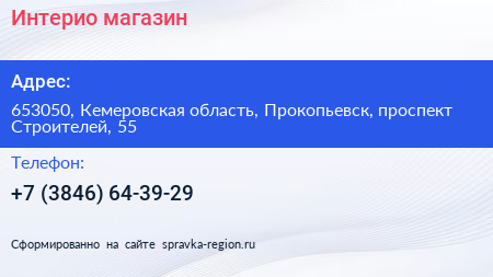 Интерио, магазин по адресу 653050, Кемеровская область, Прокопьевск, проспект Строителей, 55 в дальнейшем Организация, размещена в следующих категориях: