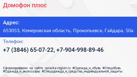 Домофон плюс по адресу 653053, Кемеровская область, Прокопьевск, Гайдара, 50а в дальнейшем Организация, размещена в следующих категориях: