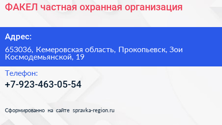 ФАКЕЛ, частная охранная организация по адресу 653036, Кемеровская область, Прокопьевск, Зои Космодемьянской, 19 в дальнейшем Организация, размещена в следующих категориях:
