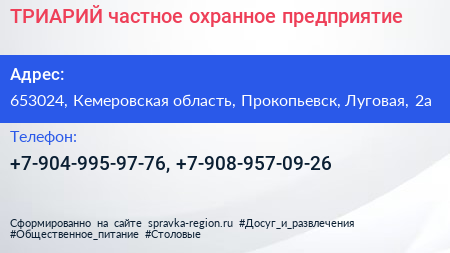 ТРИАРИЙ, частное охранное предприятие по адресу 653024, Кемеровская область, Прокопьевск, Луговая, 2а в дальнейшем Организация, размещена в следующих категориях:
