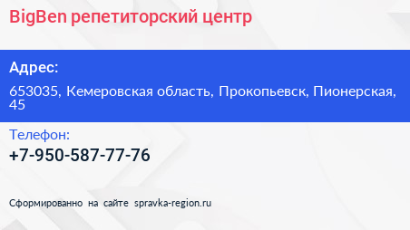 BigBen, репетиторский центр по адресу 653035, Кемеровская область, Прокопьевск, Пионерская, 45 в дальнейшем Организация, размещена в следующих категориях: