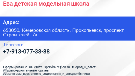 Ева, детская модельная школа по адресу 653050, Кемеровская область, Прокопьевск, проспект Строителей, 7а в дальнейшем Организация, размещена в следующих категориях: