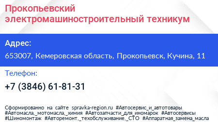 Прокопьевский электромашиностроительный техникум по адресу 653007, Кемеровская область, Прокопьевск, Кучина, 11 в дальнейшем Организация, размещена в следующих категориях: