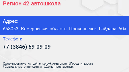 Регион 42, автошкола по адресу 653053, Кемеровская область, Прокопьевск, Гайдара, 50а в дальнейшем Организация, размещена в следующих категориях: