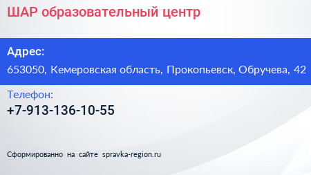 ШАР, образовательный центр по адресу 653050, Кемеровская область, Прокопьевск, Обручева, 42 в дальнейшем Организация, размещена в следующих категориях: