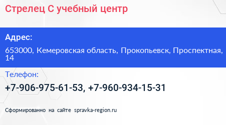 Стрелец С, учебный центр по адресу 653000, Кемеровская область, Прокопьевск, Проспектная, 14 в дальнейшем Организация, размещена в следующих категориях: