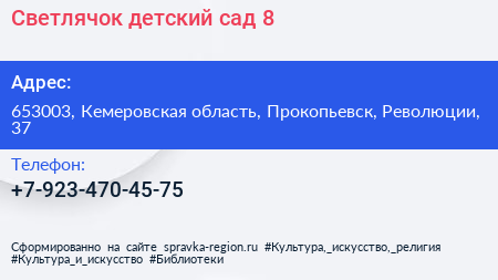 Светлячок, детский сад №8 по адресу 653003, Кемеровская область, Прокопьевск, Революции, 37 в дальнейшем Организация, размещена в следующих категориях: