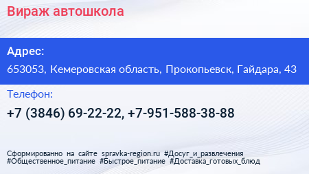 Вираж, автошкола по адресу 653053, Кемеровская область, Прокопьевск, Гайдара, 43 в дальнейшем Организация, размещена в следующих категориях: