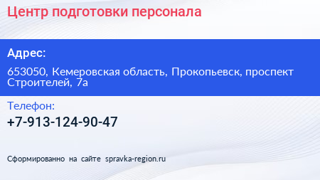 Центр подготовки персонала по адресу 653050, Кемеровская область, Прокопьевск, проспект Строителей, 7а в дальнейшем Организация, размещена в следующих категориях: