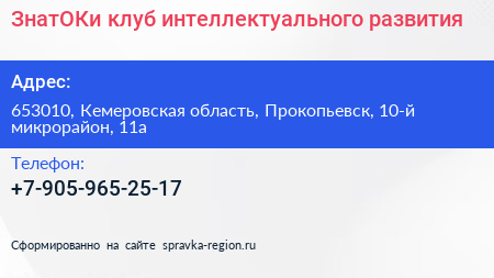 ЗнатОКи, клуб интеллектуального развития по адресу 653010, Кемеровская область, Прокопьевск, 10-й микрорайон, 11а в дальнейшем Организация, размещена в следующих категориях: